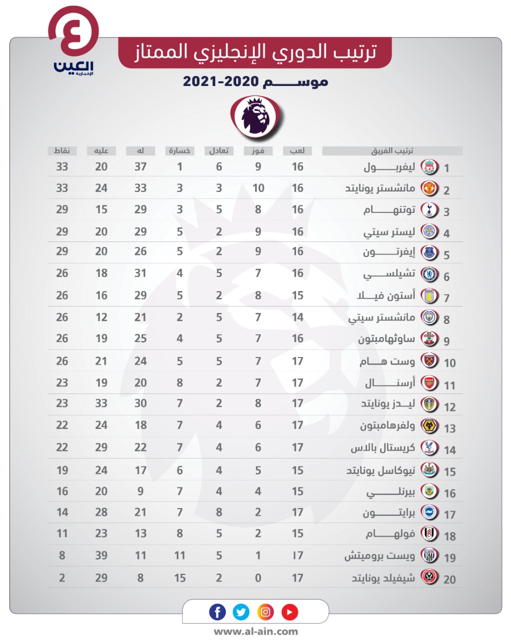 جدول ترتيب الدوري الانجليزي بعد اليوم الأخد الموافق 31-1-2021 اعرف أخر التحديث. المباريات المباشرة سيتم إحتساب نقاطها اثناء المباراة.
