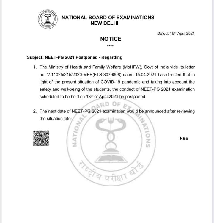 In light of the surge in COVID19 casesGoI has decided to postpone NEETPG2021 exam which was earlier scheduled to be held on Apr 18. The medical entrance exam had been scheduled for April 18. Earlier the exam was scheduled to be held on April 18 but got postponed.